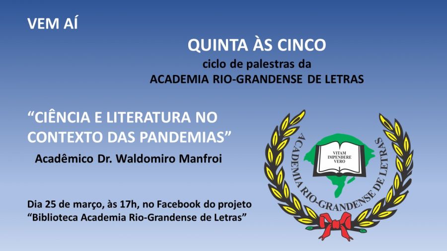 A Academia Rio-Grandense de Letras convida para a palestra inaugural do ciclo “Quinta às cinco”, que ocorrerá na quinta-feira, dia 25 de março de 2021, às 17 horas, com transmissão ao vivo pela página do projeto Biblioteca Academia Rio-Grandense de Letras no Facebook. O conferencista será o acadêmico Waldomiro Manfroi, ocupante da Cadeira 30, que abordará o tema “Ciência e literatura no contexto das pandemias”.