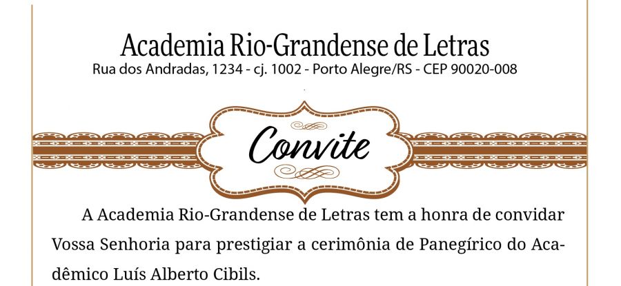 A Academia Rio-Grandense de Letras tem a honra de convidar Vossa Senhoria para prestigiar a cerimônia de Panegírico do Acadêmico Luís Alberto Cibils.