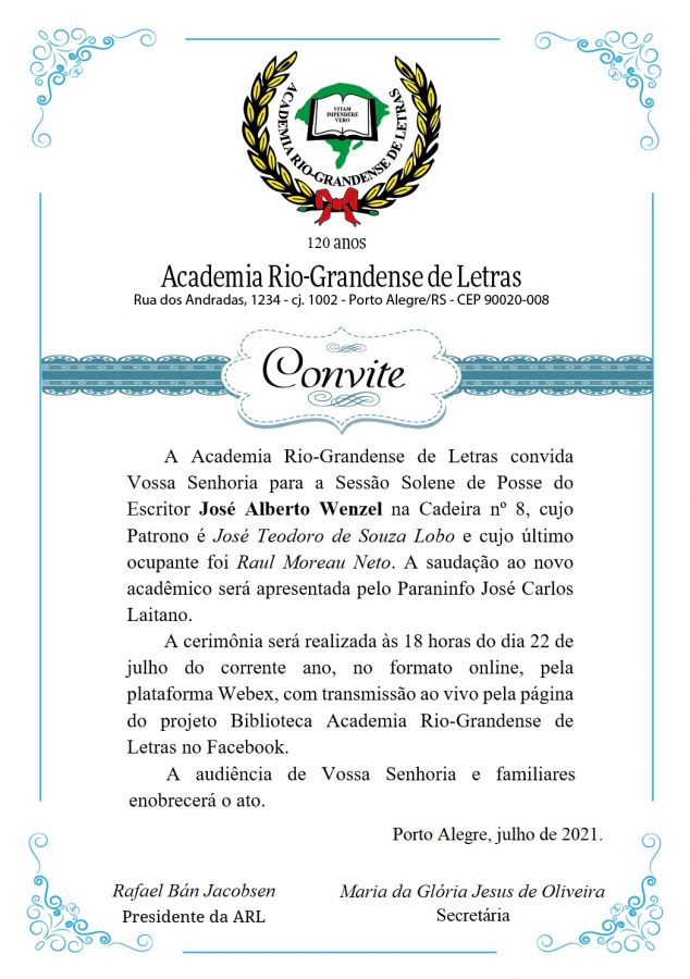 A Academia Rio-Grandense de Letras convida Vossa Senhoria para a Sessão Solene de Posse do Escritor José Alberto Wenzel na Cadeira nº 8, cujo Patrono é José Teodoro de Souza Lobo e cujo último ocupante foi Raul Moreau Neto. A saudação ao novo acadêmico será apresentada pelo Paraninfo José Carlos Laitano.