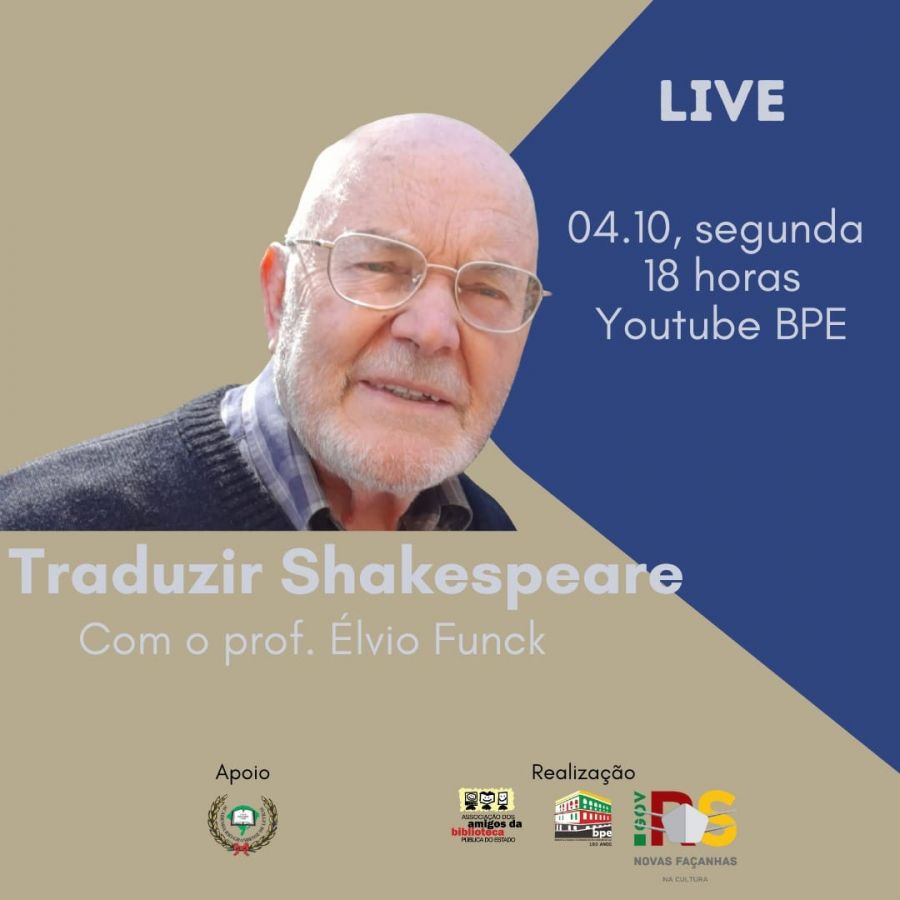 No dia 04/10/2021, segunda, às 18h, a Associação dos Amigos da Biblioteca Pública do Estado, com apoio da Academia Rio-Grandense de Letras, realizará uma live com o Prof. Élvio Funck, com transmissão ao vivo pela página da BPE no YouTube.